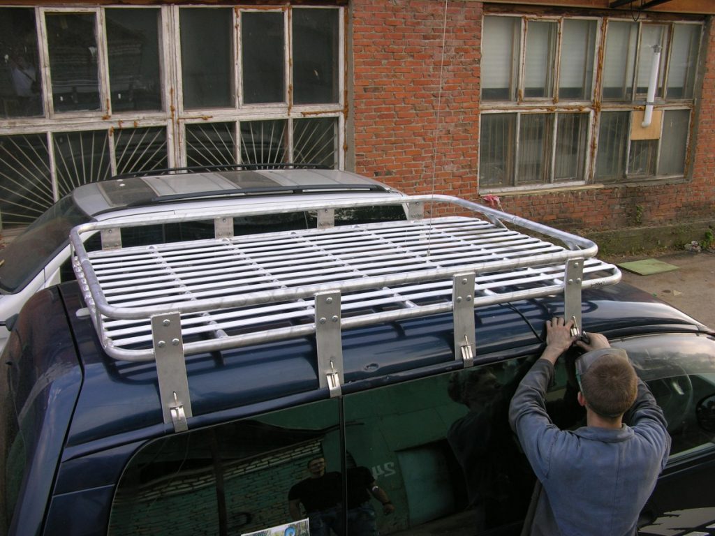 профиль алюминиевый 20*40, заглушки 20*40, нержавейка шайбы+болты 8*80 под шестигранник, чтоб с усилием затянуть и проставки полипропиленовые, залил чуток герметика в резьбу на крыше и обмазал проставки, потому что предварительно залив воды в отверстие, он ушла тут же.