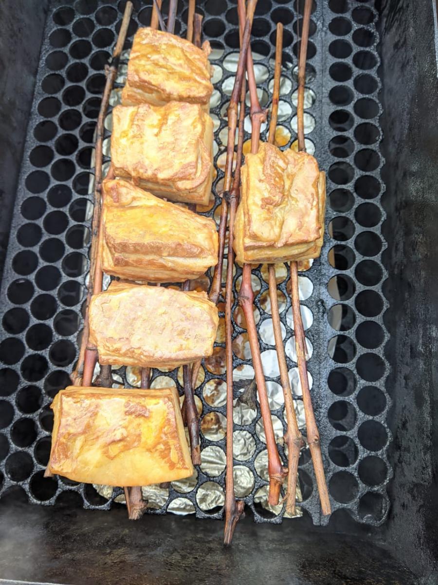 На мангале стоит подставка, на ней стоит коптильня с гидро затвором.