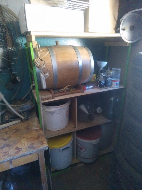 Короче, слепил вот такой алкоголический стеллажик на котором прописал 50 литровую бочку. ( Кста, бочка стоит под уклоном 2 см на метр специально.)